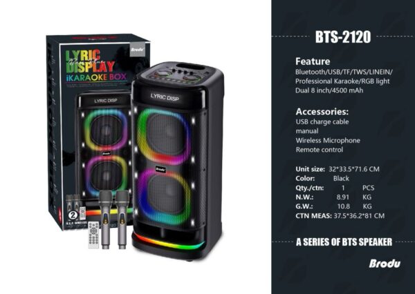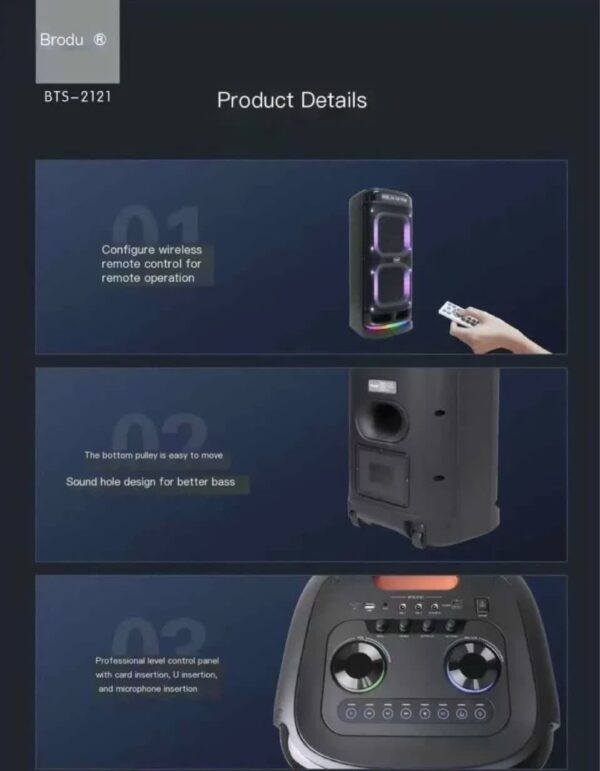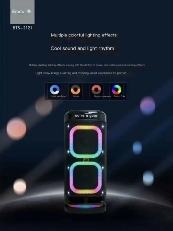 اگر به دنبال یک اسپیکر بلوتوثی قابل حمل با طراحی زیبا، امکانات کامل و صدای قوی هستید، اسپیکر برودو BTS-2121 انتخابی عالی برای شماست. این مدل با ترکیبی از صدای شفاف، بیس قدرتمند و طراحی سبک، برای افرادی که همزمان به کیفیت و راحتی اهمیت میدهند، طراحی شده است.